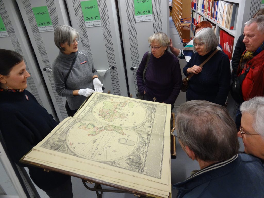 Die Mittagspause konnte auf vielfältige Weise genutzt werden. Eine Stärkung bot das ortsansässige Café. Wer darüber hinaus Hunger nach zusätzlichem Wissen verspürte, konnte zum einen an einer Führung durch die Brandenburgica-Abteilung der Stadt- und Landesbibliothek im Hause teilnehmen. Der inhaltliche Schwerpunkt lag hier neben einer allgemeinen Einführung vor allem in der Vorstellung der Schriften des frühen, oftmals vergessenen märkischen Chronisten Andreas Engel (1561–1598). Zum anderen konnte man abermals den Ausführungen Stephan Felsbergs lauschen. Er stellte ein Projekt des Künstlers Klaus Zolondowski mit dem Namen „Tuchener Kartenwerke “ vor. Im Zentrum der kleinen Ausstellung steht dabei die künstlerische Interpretation historischer und für die ortsgeschichtliche Forschung durchaus relevanter Karten, wie etwa der sogenannten „Schmettauschen Karte“, stets bezogen auf den Ort Tuchen (Landkreis Barnim).