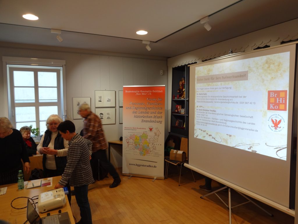 Ganz im Zeichen einer ortsbezogenen Familiengeschichte stand die vom Heimathistoriker Gerd Palwitz organisierte Veranstaltung zur brandenburgischen Försterdynastie Grußdorf. Zunächst referierte Herr Dr. Dr. Markus Vette über die wesentlichen Ereignisse der allgemeineren Wald- und Forstgeschichte. Ergänzt wurde er in seinen Ausführungen durch Herrn Palwitz, der an vielen Stellen interessante ortsgeschichtliche und genealogische Fakten einschob. Eine Jagdhornbläsergruppe bildete den passenden musikalischen Rahmen. Die Beratungsstelle war auf Anfrage von Herrn Palwitz mit vor Ort und konnte wichtige Eindrücke auf diesem Gebiet der Heimatgeschichte sammeln.